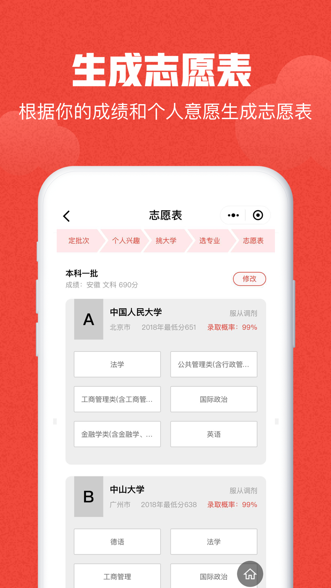 极志愿是一款专业的志愿填报软件,平台采用智能和大数据帮助用户根据分数来填报大学,根据用户所在地区、分数、专业意向、学校意向来提供参考,帮助用户被心仪大学录取