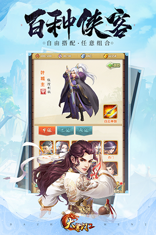 大掌门2混服众多原创的特色武侠角色,所有的人物卡牌都可以自由收集,培养喜欢的武侠角色,不同的角色有着不同属性技能,不同的卡牌组合也有着不同的战斗加成