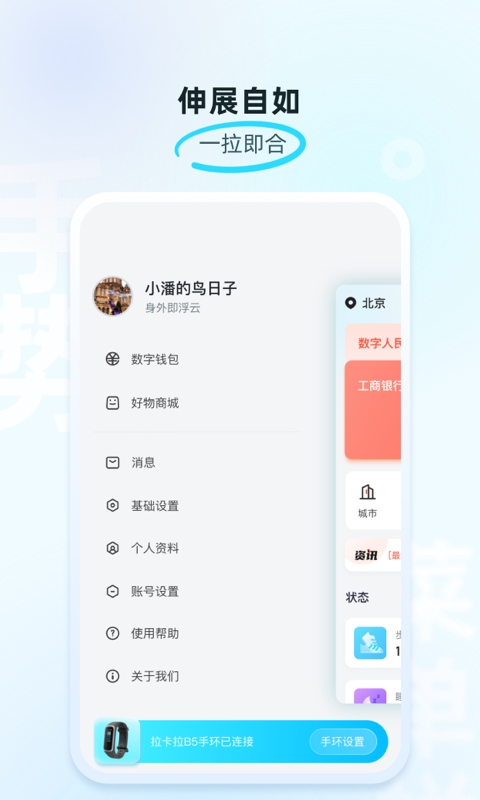 拉卡拉手环是拉卡拉手环的配对应用,带着拉卡拉手环刷地铁、坐公交,各大商超闪付消费,余额不足可以随时随地空中充值不用排队,根据用户每日的运动睡眠情况提供私人定制的运动健康建议