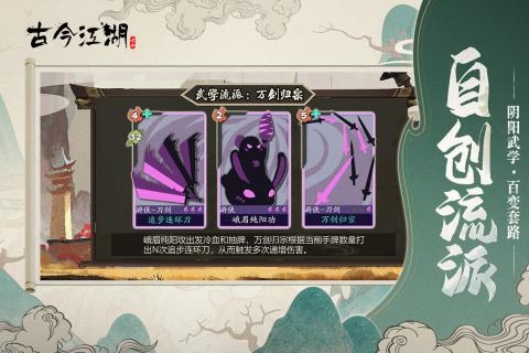 《古今江湖》是一款武侠风Roguelite DBG(卡组构筑游戏),以过图闯关为主要玩法,玩家在关卡中不断的获取新的卡牌替换旧的卡牌,组建出理想的卡组流派,对抗强大的带头大哥。四大职业数十种武侠,数百种武学,更有套装、神兵、经脉等元素,让你构建出意想不到的卡组!