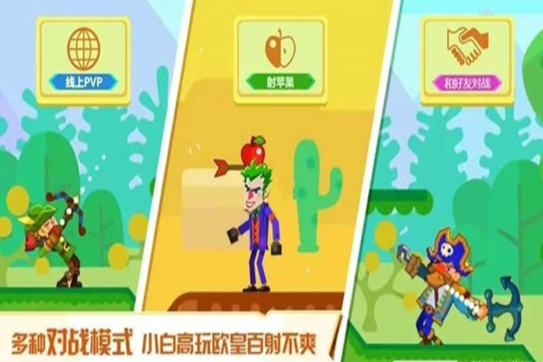 游戏采用了经典的卡通风格,色彩鲜艳,画风可爱,玩家在游戏中需要利用了自己手中的武器以抛物线的形式飞射对手,并且击中对手后还有丰富的奖励。游戏中不但拥有线上对战、锦标赛、与电脑对战、与好友对战、猎鸟和射苹果六大模式可供您自主选择,还加入了大量的新颖的人物、技能及皮肤造型系统,从而让原本显得的单调游戏更具魅力色彩,各式各样的主题投掷对决,有效的力度和角度把控,辅以血淋淋的勇士较量,带给你更加突出、独特的抛物线投掷游戏全新体验。