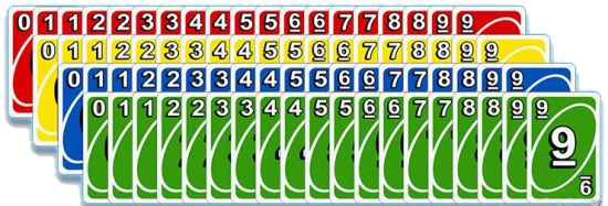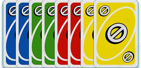 UNO牌由108张卡牌构成,包括76张数字牌、24张功能牌和8张万能牌。同时UNO牌由四种颜色构成,包括红色、黄色、蓝色、绿色。