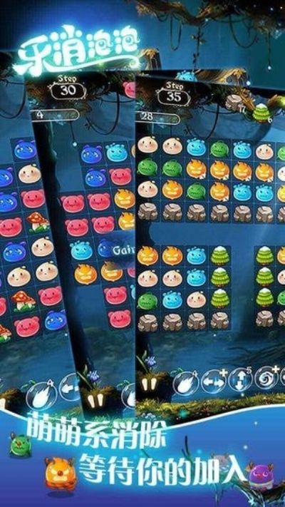 1、简单的消除游戏,游戏中有7种不同外形的泡泡史莱姆,两个同颜色的点击以后即可消除。
