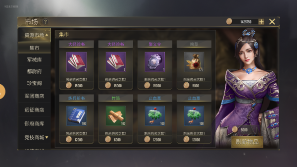 热血三国无双主公等级达到10级,开放集市商城,集市中会出售武将经验书、陨铁、训练材料、神器宝箱、宝物碎片、粮草等常规资源,消耗元宝或铜钱可进行购买。点击集市中的刷新按钮,可刷新当前商品。