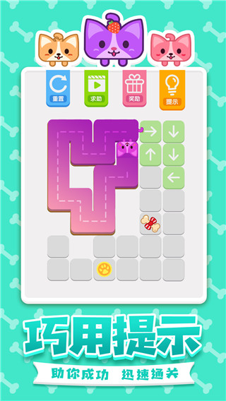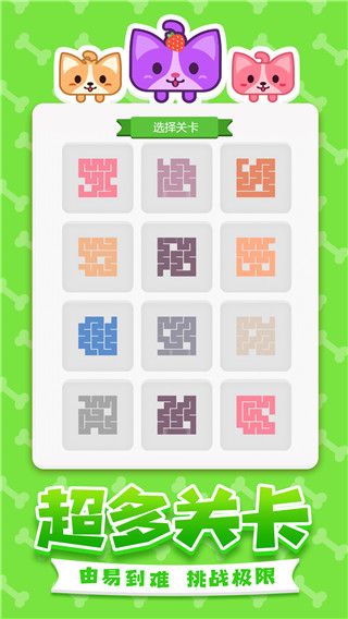 游戏中你可以选择不同难度的关卡,通过操控着可爱的汪星人,一笔画来完成各种路线,萌趣欢乐无极限,还可以完整更多的特色关卡,获得不同的道具,你可以使用这些道具做提示,快来挑战吧
