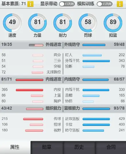 如上,速度最好60以上越高越好(防对面大哥的核心,速度太慢防不住)。耐力80以上。其他越高越好不做强制(力量无所谓,罚球决胜时候砍pg,扣篮看比赛就知道一场比赛出手次数屈指可数)