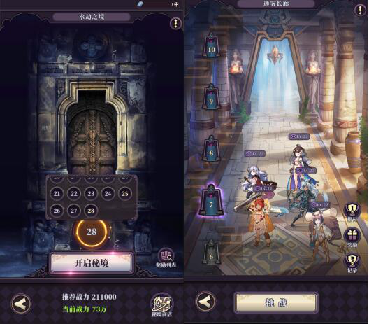 挑战层数越高,难度越大,奖励越丰富。获得的秘境结晶可以在秘境商店兑换装备。