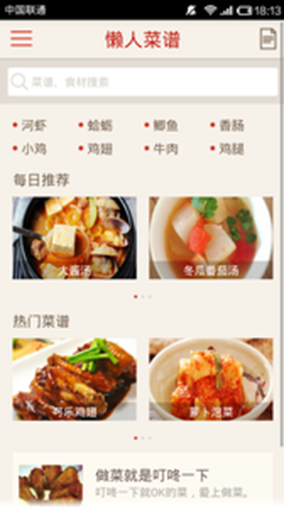 《懒人菜谱》是一款学习做菜的软件。专门为懒人学习做菜打造,用户可以通过简单易学的步骤学做可口美味的佳肴。菜谱包括各类菜系,肯定有你爱吃的,吃货不妨自己动手做一做学习一下,你一定会在不断尝试学习的过程中体会到烹饪的乐趣。快来下载体验吧。