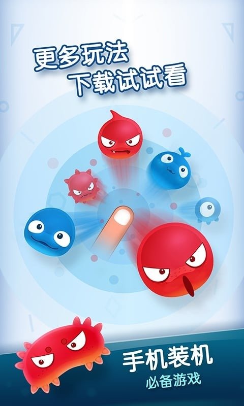 清新卡通的游戏画风,QQ微信双平台自由的邀请好友进行对战,控制细菌角色进行膨胀变大,通过点击的方式不断成长压倒对面获胜