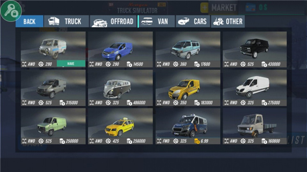 3、这里有各种各样的卡车,你可以选择一种,5种不同的卡车类型,你可以自定义和升级,完成各种运输任务,获得奖励。