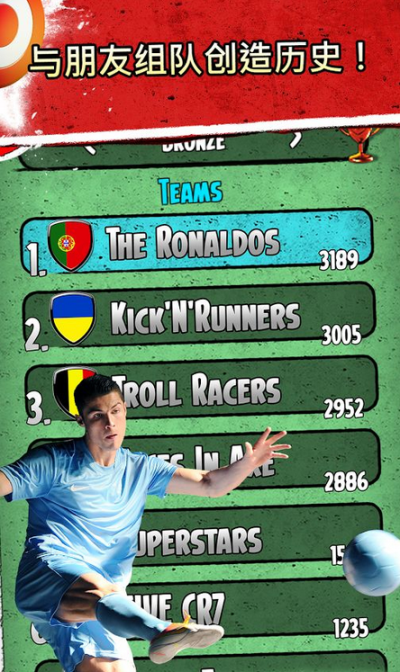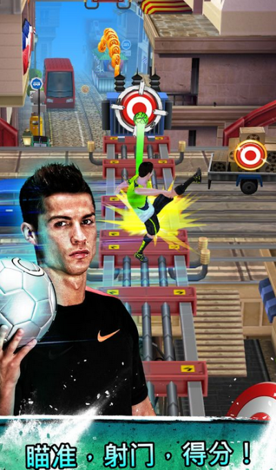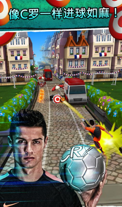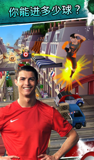 《C罗跑酷 Cristiano Ronaldo: Kick'n'Run》是由Hugo Games A/S提供的一款以C罗为主角的跑酷游戏。这是一款别具一格的跑酷游戏,除了游戏的主角是CR7之外,还在传统的跑酷中融入了足球的传带射等元素,让人体验像CR7一样踢球和奔跑的感受。在带球前进的过程中,除了需要躲开传统的障碍之外,你还需要注意来自其他球员的飞铲。在路上还会出现靶子,这是你便可以选择射门得分,体验足球游戏的乐趣。