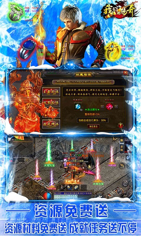 1、延续经典传奇PK爆装玩法,首创装备投保功能,贴心保护游戏装备。装备培养属性与角色绑定,可随心所欲更换装备而不影响培养效果,让游戏装备长久保值