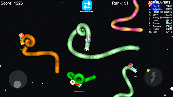 1、控制摇杆走位你的小蛇,吃掉地图上彩色的小圆点,就会变长。