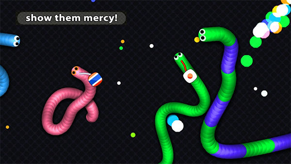 2、小心!蛇头碰到其他贪吃蛇就会死亡,并且产生大量小圆点。
