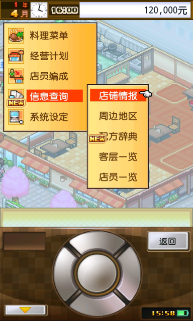 首先要准备桌椅和器具,做好迎接客人的准备.吃料理的客人,会根据店的气氛和待客给予点数得到高分后会从客人那里得到(餐桌礼仪研究会)(儿童礼物或者儿童套餐吧)(宇宙饮料试饮会)等新的服务提案.开发新店的话店的人气会迅速上升.培养店员,做出好吃的料理,让大家吃的满意吧.也可以经营多个店铺,是非常完美的模拟经营游戏。