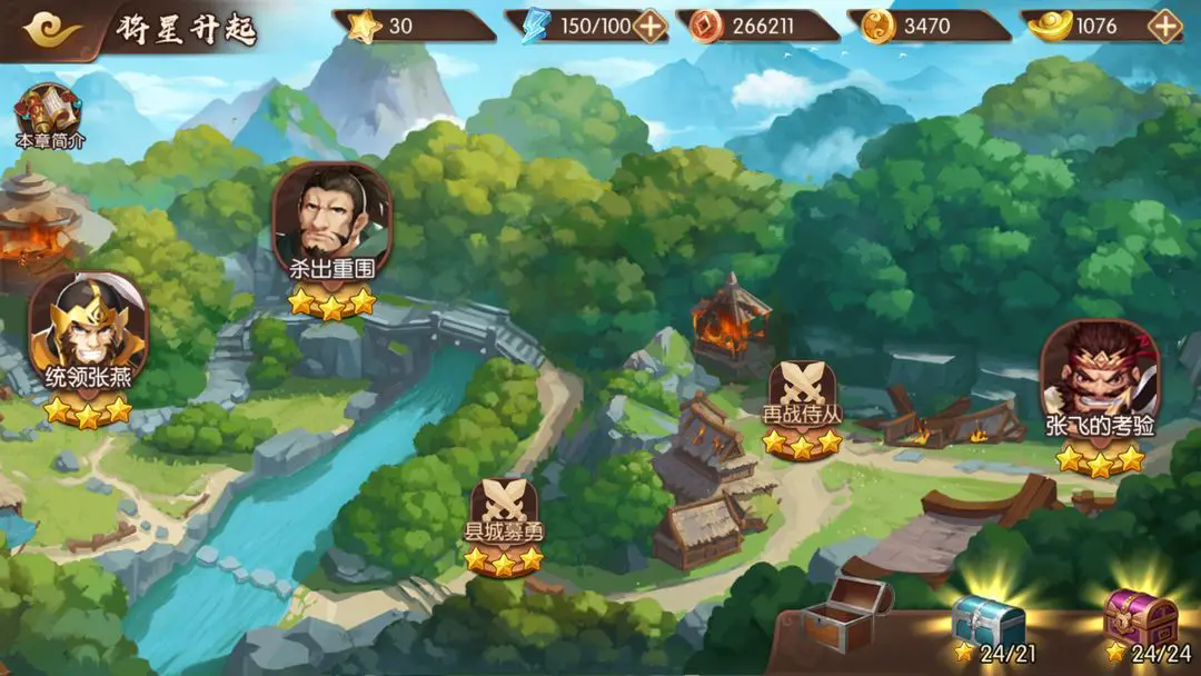 在征战天下模式中,每一个关卡均有通关奖励,奖励包括随机掉落【经验书】、【武将碎片】、【符石碎片】等资源,当玩家通关闯关累计一定的星星数量时,还可额外开启奖励宝箱。