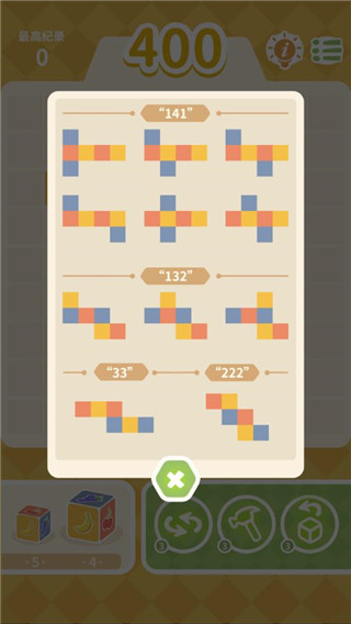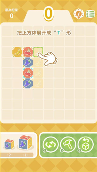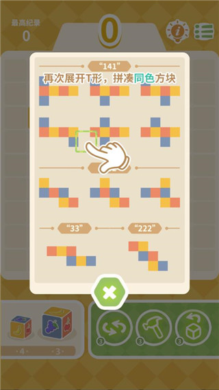 游戏的玩法很经典,经典的三消玩法,但是跟传统的三消玩法又有一点不太一样,这里是一个正方体,你要将拆开的正方体放置到你觉得合适的格子里面,只有那一块区域的正方体能够合拢形成正方体就可以消除,还是很考验玩家的脑力的