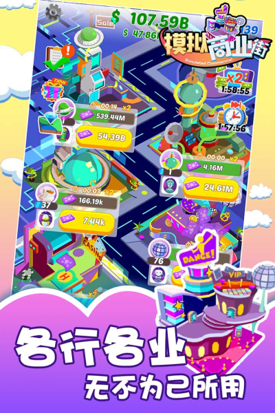模拟商业街软件中有各色各样的商业大楼,一键开启你的创业之旅,感受商家赚钱的乐趣,模拟商业街不同行业等你创造