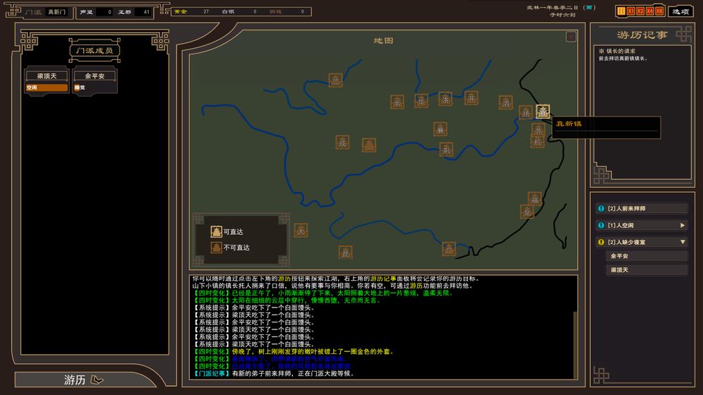 真正的江湖人定然也是漂泊的,门派里的忙碌生活自然并不是一切。你还需要以掌门的身份带着弟子们下山游历,追寻当年灭门的真相