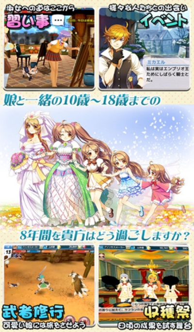 《美少女梦工厂》中女儿的养成方式亦是丰富多样,教育、兼职、培育修行等养成方式随意选择,想怎么养就怎么养!想要给女儿完美的教育,可以给她安排满满的课程,格斗之理解、科学理念、诗文学概要、神学之诞生等全面培养女儿的文化气质修养;完成课程之后,女儿的智慧、信仰心、魔力抗性等相关分数都会有所增加。另外,还可安排兼职活动来为女儿赚取家用或者零花钱,兼职场所的选择亦是天马行空,随意选择:教堂、美容院、农场甚至墓地等,应有尽有!还可以对女儿进行武士修行培育,四张地图,十天修炼,百种怪物,尽情挑战吧!