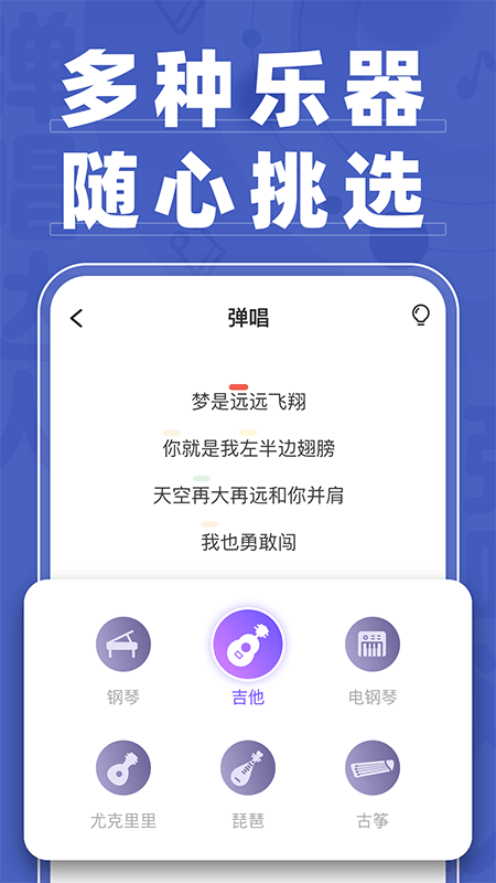 《弹唱达人》是一款专为爱唱爱玩的你设计的一款自弹自唱自伴奏的软件,集钢琴、吉他、架子鼓等多种乐器伴奏功能于一体的音乐弹唱软件,给你想不到的创作体验,带你玩转音乐。只需轻点彩色键盘,即可敲出你喜欢的音乐伴奏,配上你动听的歌声,你就是完美的唱作人,随时随地录制属于你的歌曲!