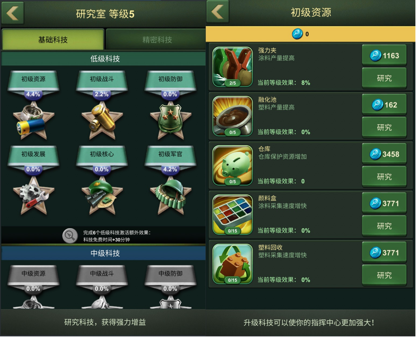 研究所研究能够永久性提升我们生产养成战斗的全方面能力,所以在新手期如何高效进行研究非常重要!前期我们主要针对基础科技进行提升,比较高效的加点方法是根据你的发展策略进行加点:例如你是喜欢通过战场采集掠夺来加快发展,可以优先提升战斗和发展模块里的相关加成;如果是喜欢通过发展城内经济,可以优先选择资源模块;建议优先把低级科技的六个模块都升满再开始研究下一级科技,这样可以获得额外科技研究时间加成,为后续科技研究节省时间。