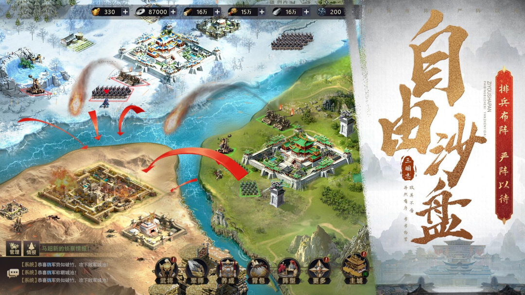 1、每位武将都能够自由成长,还有专属神兵等着你来收集,还有羁绊技能阵容搭配。