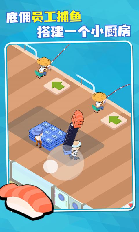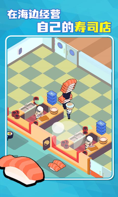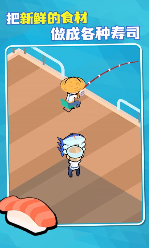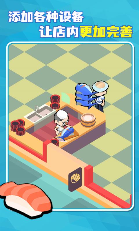 经营自己的寿司店,雇佣员工捕鱼,马上把最新鲜的食材做成各种寿司。顾客吃完满意离开后,收集留下的金币。用金币在店内添加各种新设备,更好的赚取金币
