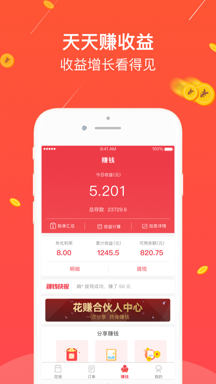 2、用户购物消费存入花赚钱包,每天产生利息收益,利息收益可随时提现,帮助用户赚钱;