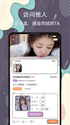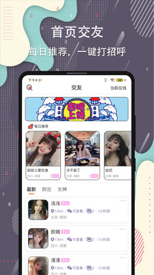 3、首页交友超简单,这里为大家提供了一键打招呼的功能,每天都会推荐很多你附近的同城好友,你可以直接与大家打招呼交友。