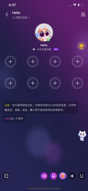 在天喵星用你的声音去进行交流,里面有众多的房间,每个房间有不同的主题,动漫,影视,游戏等,多人在线同时连麦,一起聊天