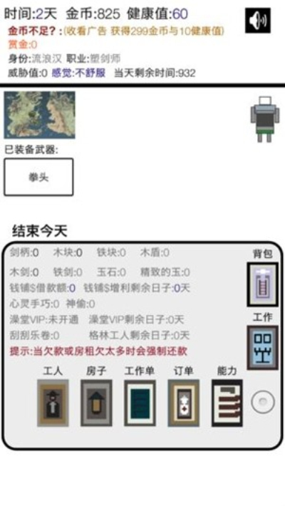 时运不济,你真的成了一名流浪汉,以前发生的事情就此翻篇,让我们重新开始新的生活吧!趁着还有力气,先找一份工作,目前能做的就是当食品工人或者看门的,食品工人每天赚10块钱,看门的半天赚7块钱,不过看门的有一定几率被老板逮到,被反扣5块。在你进入工作状态的时候什么都干不了,只能傻等着。