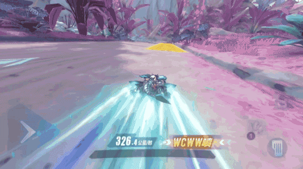 常规赛道无加速带提升速度,而粉色植被捷径处可以全程踩着加速带通过,进一步提升了通过捷径的效率。全局可省下2秒左右的时间。