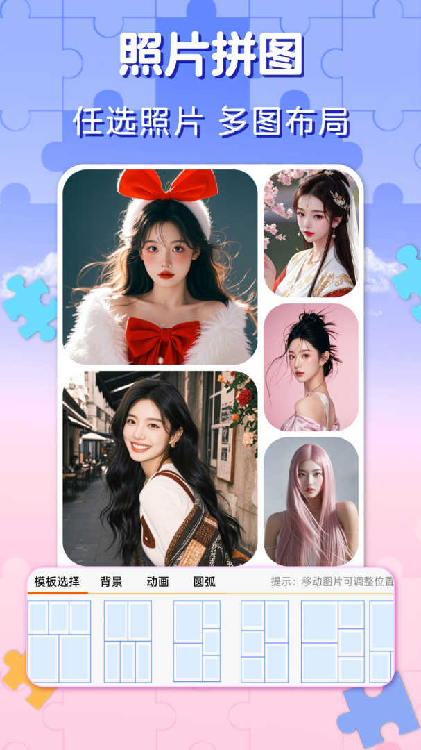 本应用是一款功能全面的拼图工具,可让你方便地进行照片拼贴、照片组合,从此你可以更好地去晒你的照片了!本应用提供了魅影拼图、常规拼图、单词拼图、3D拼图、超现实拼图等不同的拼图方式,并且提供了大量的模版、贴图,同时你可以对图片进行滤镜处理,使你很方便地进行图片拼接,并且免费保存和分享制作的照片拼图,赶紧下载这款应用,制作有趣的图片拼贴吧。