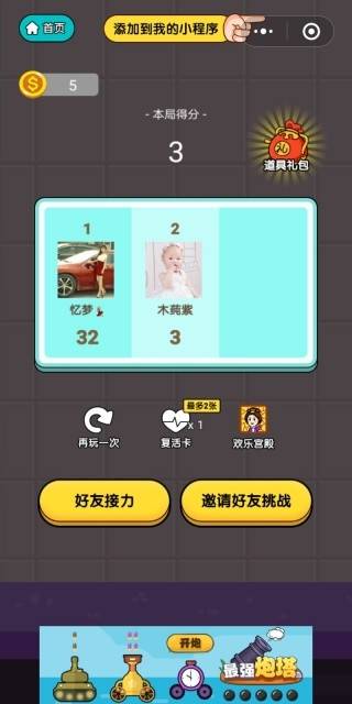 在我们玩对局的过程当中,不小心被机关给KO了的话,我们也有2次复活的机会,一次是通过分享,还有一次是观看厨房大逃亡小程序提供的广告视频来复活的。
