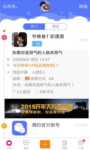 【约会交友】与周边的人发起聚会活动,让彼此不再陌生。