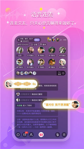 真实、靠谱、快速的语音社交软件,帮你解决单身烦恼,快速找到适合你的TA。多人语音社交场景、多对多派对模式,提升内容性、主题性、参与感。一键处CP,你会发现声音动听、风趣幽默的小哥哥小姐姐,喜欢就去认识ta们。平台直播功能强大,人人可以开播,展示自己的魅力。