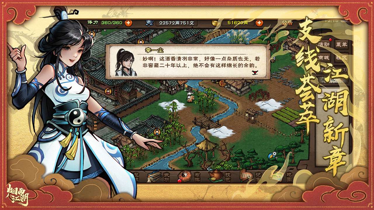 烟雨江湖bilibili版是一款充满魅力的武侠角色扮演手游,玩家将在广袤的江湖中踏上冒险之旅,自由探索、学习多种武功,与各路高手切磋。游戏为你提供丰富多样的玩法选择,每一个决定都将塑造出独特的人物成长轨迹。视听体验上,轻快动人的背景音乐与精致的2D卡通画风相得益彰,保证让你沉浸其中。在内容上,游戏系统设计精细且剧情精彩,令人欲罢不能。超高的自由度虽带来挑战,但也是玩家施展才华的舞台。你是系列老粉还是首次接触的新手,都能在此找到属于你的江湖梦。快来下载,开启属于你的英雄传奇吧!