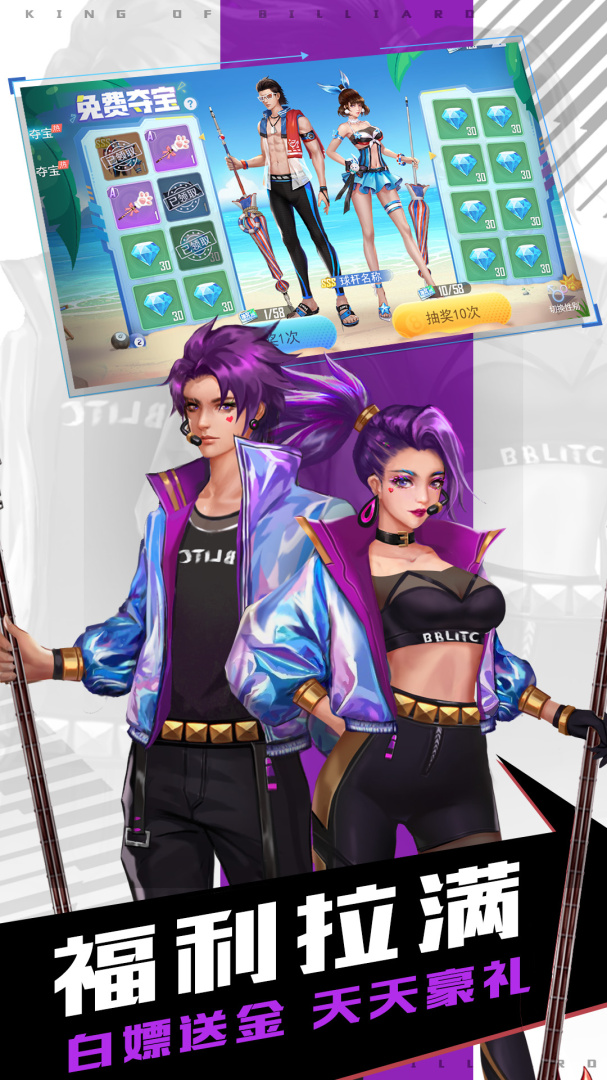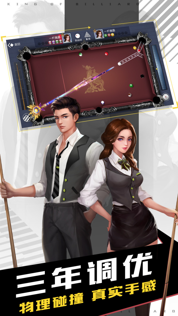 游戏还原真实桌球规则,各种丰富不同的游戏玩法,全新物理引擎计算,打造真实台球手感,还有各种炫酷的球杆等你来收集