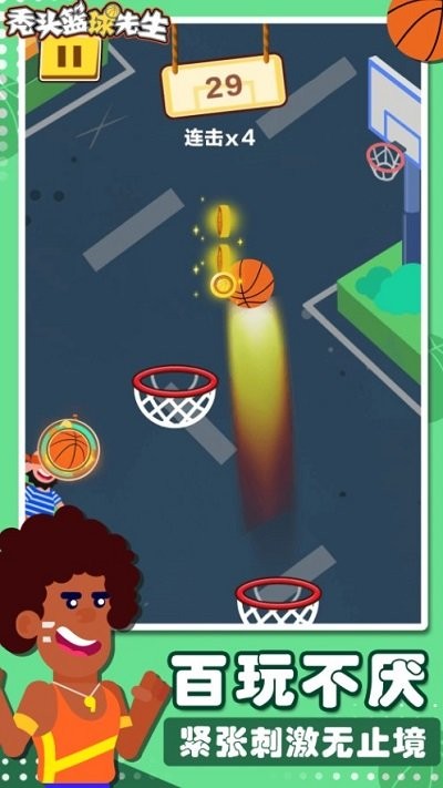 秃头篮球先生是最近非常火热的休闲闯关游戏,游戏以篮球为题材,竖屏的游戏模式,非常的轻便,随时掏出手机即可来上一局,非常适合碎片化时间利用,打发时间玩玩,玩法也非常的简单有趣,控制屏幕中的秃头来瞄准篮筐,抓准时机投篮通关