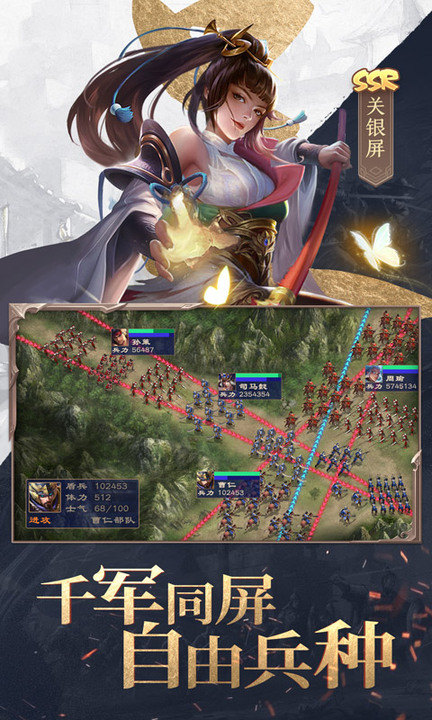 游戏共有5大兵种,枪、骑、弓、谋、车,他们通过战法技互相克制,搭配合理阵容方是取胜关键。200个技能效果,眩晕、沉默、混乱,各类效果应有尽有,丰富的技能搭配衍生出充满乐趣的战斗,这样的设定更加考验操作者的策略,想要一统江河必须先成为一名智者。