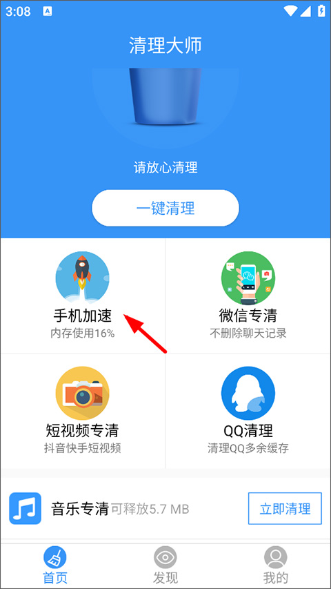 1、用户打开清理大师app,进入首页,首页中有手机加速、微信专清、短视频专清、QQ清理等功能,用户可以选择自己需要清理的项目(以手机加速为例);