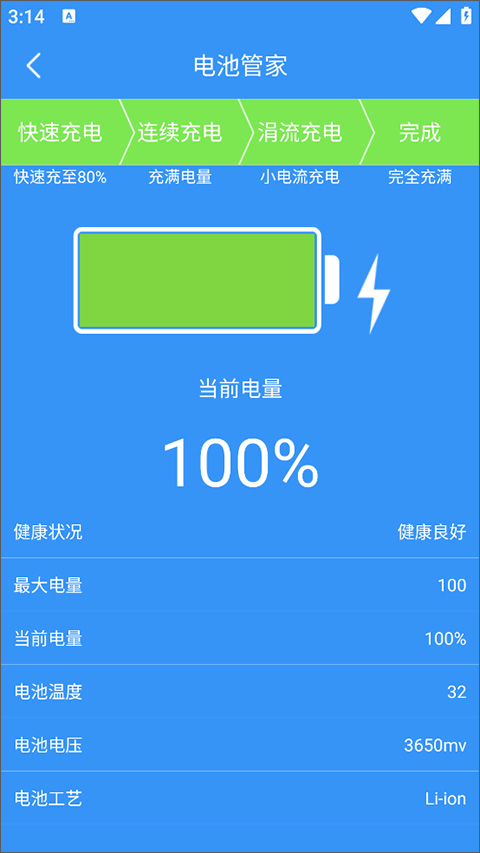 6、打开电池管家,用户可查看当前手机电量、健康状况和电池温度等内容。