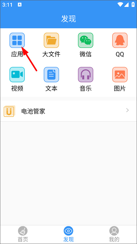 4、打开发现页面,用户可查看手机应用、大文件、微信文件、视频等缓存,点击应用;