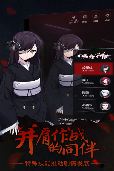 特定场景下,“我”可以选择某一名同伴前往调查。每个同伴都有不一样的能力,选择合适的同伴会对剧情推动有更好的作用。