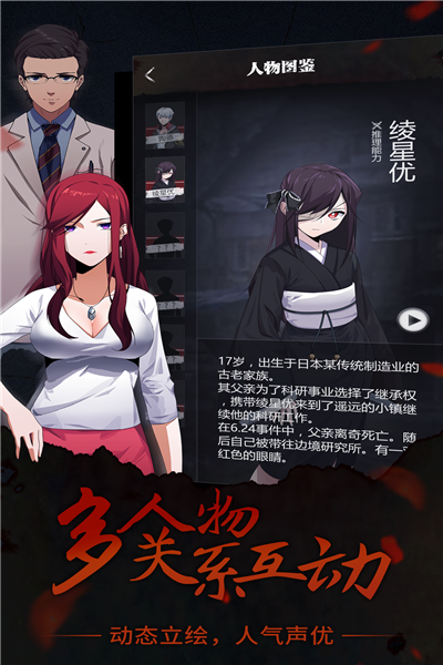 这是一款文字类手游,各种非常精美的静态图片,人物刻画的也非常生动,游戏中有着谜一样的剧情,你是否能从谜团中找回自己的记忆呢?喜欢的朋友可以前来下载体验!