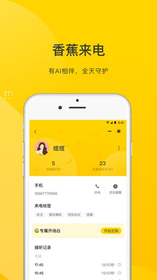 ---什么是「香蕉来电」 骚扰电话总是很多,陌生来电想知道是谁但是不敢接,出国旅游/飞机上,接不到电话,开会/参加讲座的时候手机静音,但很不巧错过了一个重要商机.... 我们想帮助您解决接电话场景的矛盾,于是创造了一款APP「香蕉来电」,TA的小名叫香蕉,是新一代的人工智能接听小助手,在您不想、不能、不方便接听来电的时候,您可以使用TA来帮您接听~