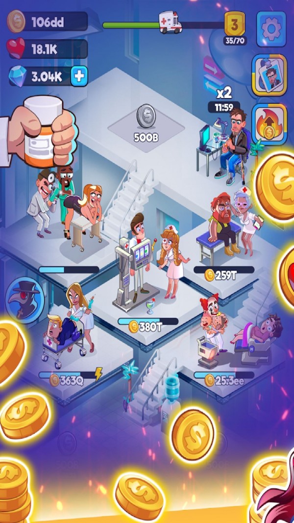 十分不错的模拟经营手游,超过15种不同的机器可以使用,还能通过升级的方式来提升效果,打造一个最强的医疗帝国,玩起来超级轻松,闲置的轻松玩法,会让你感觉像是一个真正的大亨,可以治疗病人,也能进行手术,还可以督促你的管理人!