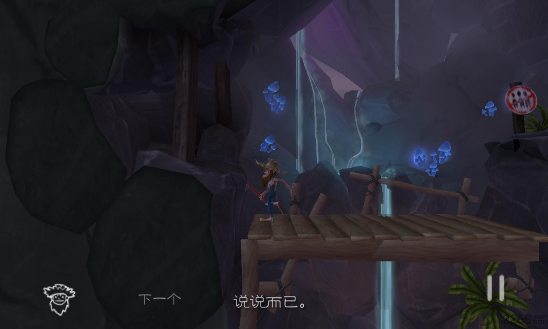 沿着道路往下走(途中如果遇到一个高坡,按屏幕上方可以控制角色跳起,就能过去了),走到道路最下方的右边尽头处,可以看到一个木箱,推动木箱向左走。
