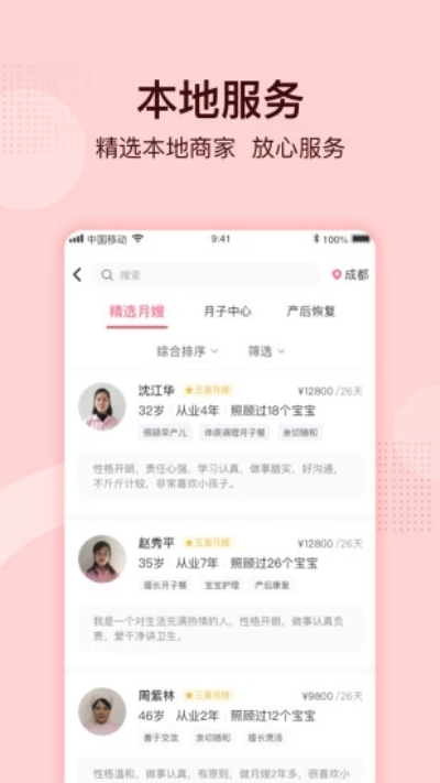 【本地服务】覆盖全国的月嫂、月子中心、产后修复、保险的本地化服务商家,让你不用操心就可以找到你需要的商家资源,每个阶段妈妈们都能感受到我们的精心呵护。